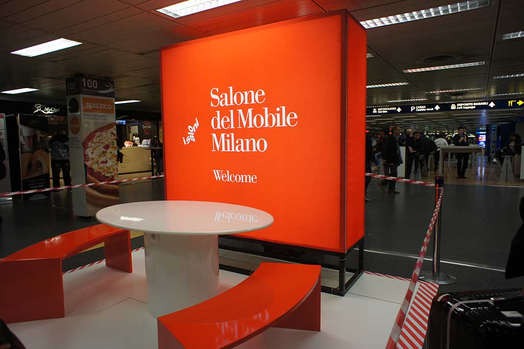ミラノ・リナーテ空港に着いて到着ゲートを出ると、ミラノサローネの特設ブースがお出迎え!